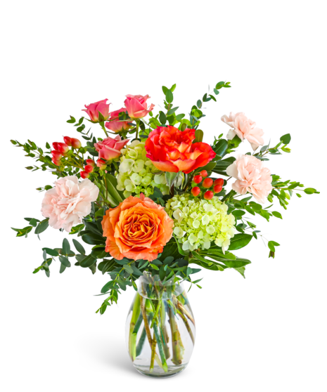 A vibrant mix of peach roses, soft pink blooms, fresh greens, and seasonal textures — designed to feel full, lively, and effortlessly beautiful in a clear glass vase.