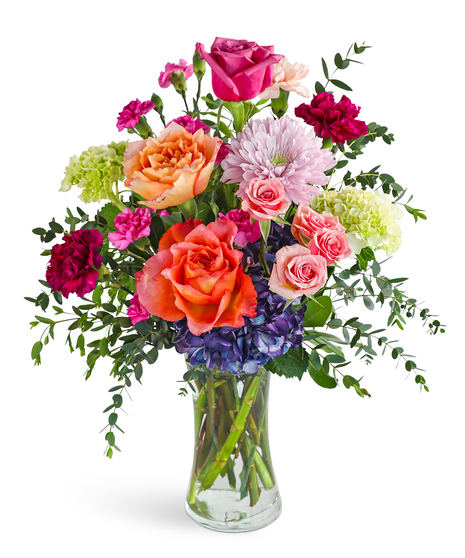 A vibrant mix of roses, seasonal blooms, and textured greenery, designed with movement, contrast, and color in every angle.