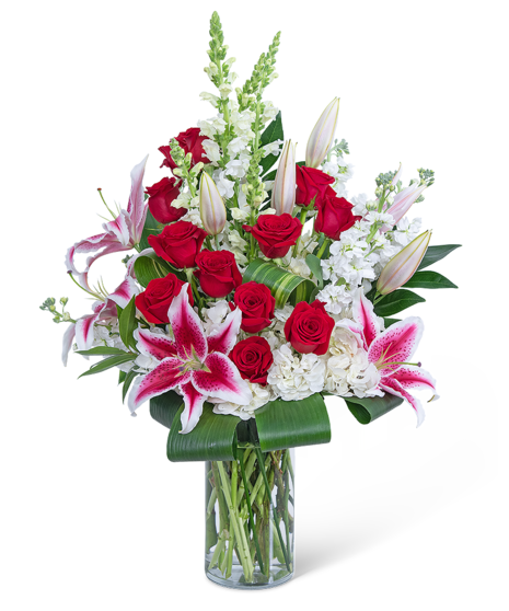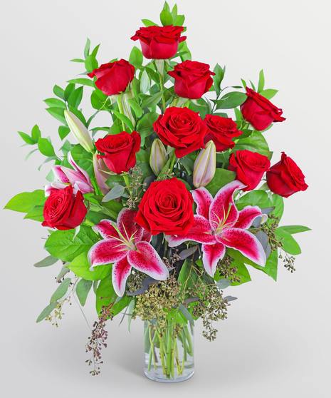 Fly Me to the Moon is a beautiful design, perfect for showing your affection to that special someone. It features red roses, stargazer lilies, and Grand Design foliage, all designed in a clear glass vase that will show well on a dining room table, desk, or end table. It is the perfect gift for Valentine's Day, a special Anniversary present, or to just send a reminder of your love.