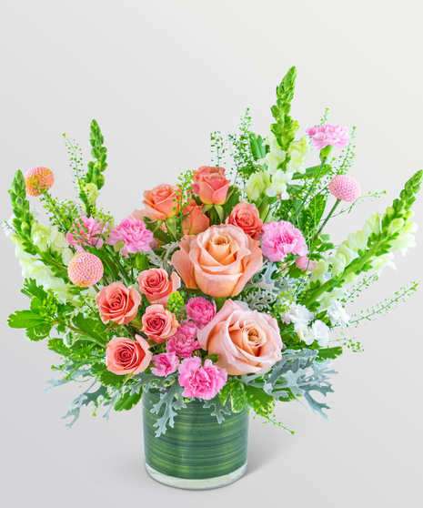 Capture the essence of romance with Rosy Letts to Juliet, an enchanting flower design that brings together the delicate colors of pink and Apricot. This elegant arrangement features a stunning mix of Roses, Carnations, Solomio, Craspedia, Snapdragons, and Grand Design foliage that complement each other perfectly. Presented in a leaf-lined cylinder vase, Rosy Apricot Sundance is guaranteed to delight any recipient and add a touch of warmth and beauty to any space.