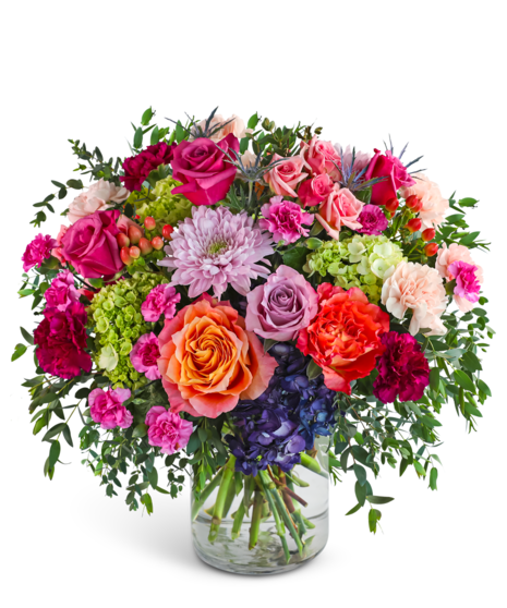 A vibrant mix of roses, seasonal blooms, and textured greenery, designed with movement, contrast, and color in every angle.