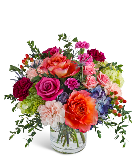 A vibrant mix of roses, seasonal blooms, and textured greenery, designed with movement, contrast, and color in every angle.
