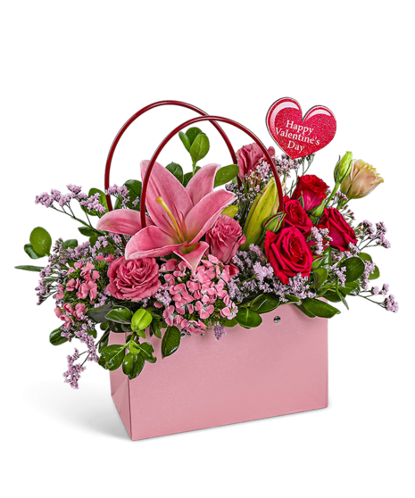 The Wedding Planner is a vibrant mix of Lilies, Roses, and seasonal accents in shades of pink and red. Designed in a trendy pink tote, it's a perfect option for birthdays, flower delivery for Valentine's Day, or a sweet surprise just because. Substitutions may be made depending on availability while keeping the overall look of the arrangement.