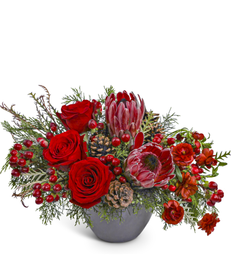 Deep, dramatic, and utterly sophisticated — Velvet Evergreen captures the moody magic of the holidays. Lush red roses and delicate butterfly ranunculus mingle with natural pinecones and seasonal greens, all nestled in a modern black clay vessel. This arrangement blends festive warmth with an edge of luxury, perfect for those who love their Christmas with a little couture flair.