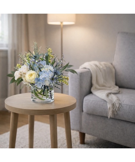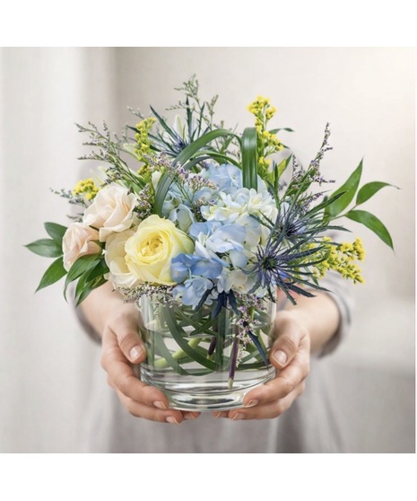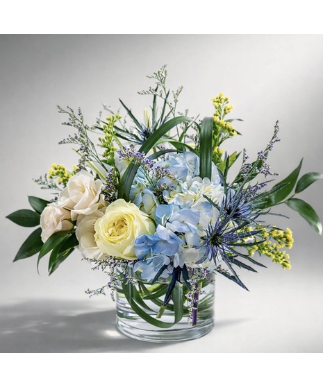 Soft blue and white blooms including hydrangea, roses, and seasonal textures, arranged in a clear glass vase for a fresh, peaceful feel.