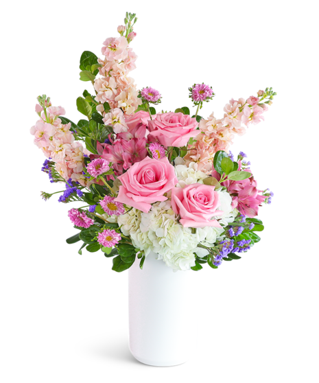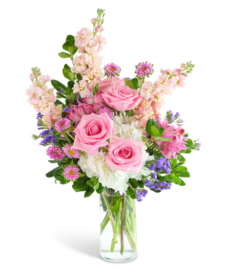 You've Got Mail is a soft and dreamy mix of Roses, Stock, Alstroemeria, Hydrangea, and seasonal accents in pastel pinks and purples. Arranged in a clear glass vase, it's the perfect flower delivery for birthdays, baby showers, or simply to make someone smile. Our florist may make subtle substitutions to maintain the sweet and delicate feel of the design.