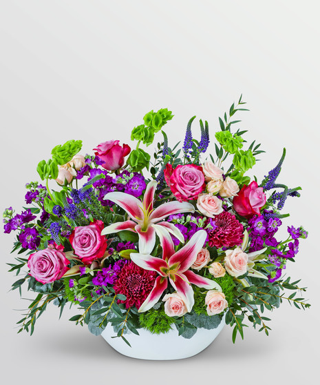 The Hyde Park Blooming flower design features a captivating blend of deep purples, pinks, and greens, exuding a sense of romance and elegance. This stunning arrangement includes roses, stock, lilies, cremons, and Grand Design foliage artistically arranged in a white vase, making it a luxurious and sophisticated centerpiece that will add a touch of opulence to any space. Embrace the beauty of nature with Hyde Park, a harmonious combination of rich hues and exquisite blooms.