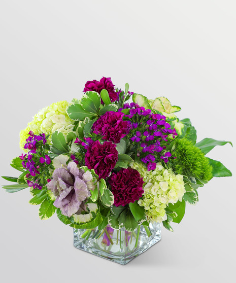 The Reigning Supreme flower bouquet is a stunning gift for any occasion and is a very popular choice! This elegant design features Carnations, Kale, Hydrangea, Dianthus, and Grand Design foliage. It's the perfect accent for an end table, coffee table, or desk and will brighten any room. This spectacular arrangement is hand-designed by our expert florists in a classic clear glass cube.
